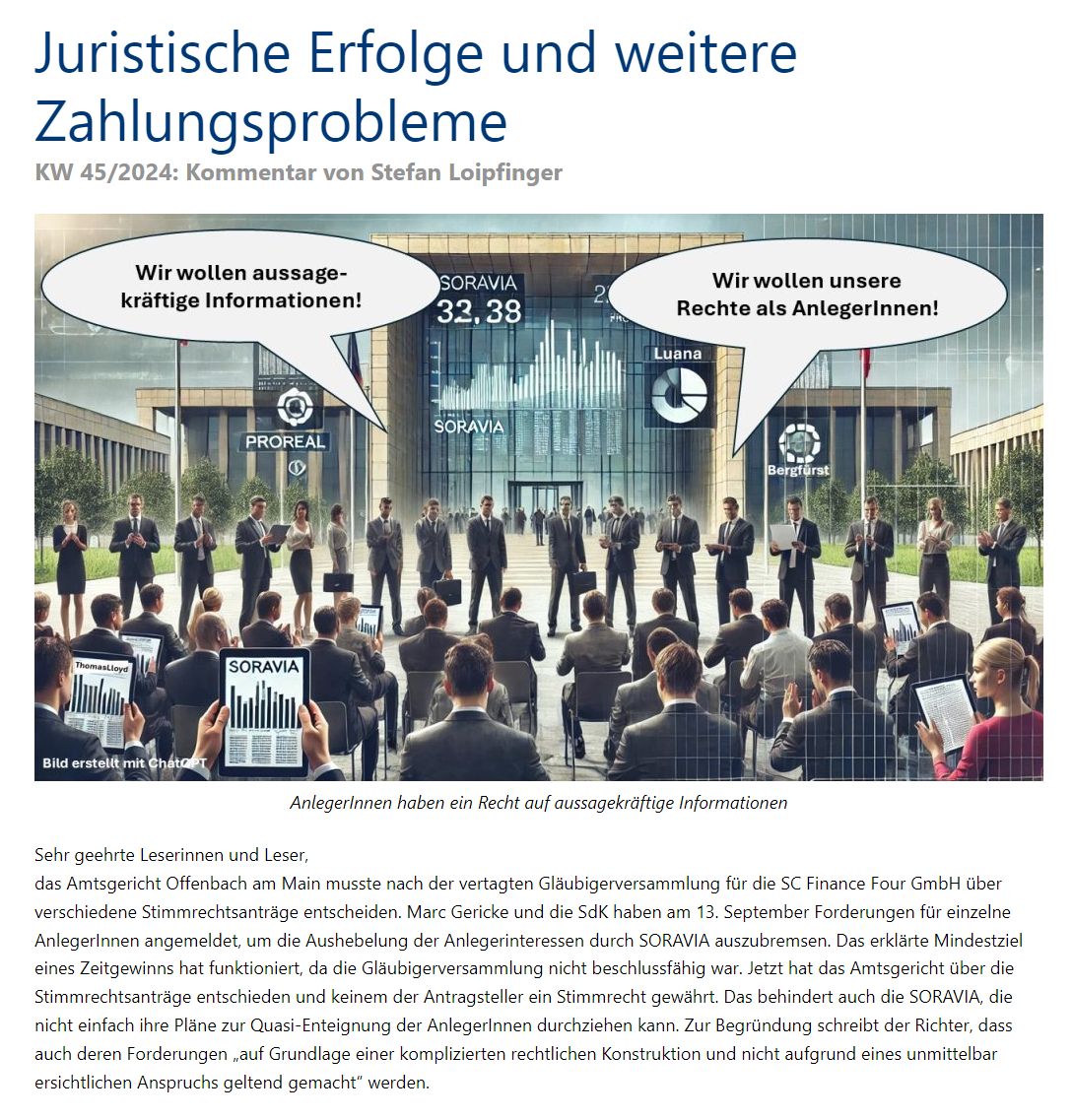 Vor zwei Wochen habe ich über die Gläubigerversammlung der SC Finance Four GmbH berichtet (Gegen die Schamlosigkeit). Die Informationslage war damals noch sehr dünn, da sich die Anwesenden bedeckt hielten. Das eine oder andere sickert aber zunehmend durch und bestätigt meine damals geäußerte Vermutung: Es kam zu keinen Beschlüssen. Der Gerichtspfleger hat die Stimmrechtsanträge verschiedener AnlegerInnen einer Richterin oder einem Richter zur Entscheidung vorgelegt. Das dauert erst einmal. Wenn in ein paar Wochen dann festgelegt wird, dass die AnlegerInnen kein Stimmrecht erhalten, könnte eine sofortige Beschwerde eingelegt werden. Als nächstes könnte der Fall bei einer zweiten Instanz landen. Selbst bei schnellen Entscheidungen wäre eine Fortsetzung der Versammlung in diesem Jahr sehr unwahrscheinlich. Das bringt das Geld nicht zurück, aber es hilft, dass SORAVIA mit ihrem völlig intransparenten und schamlosen Vorgehen nicht so leicht durchkommt.